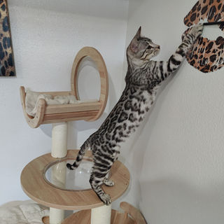 Lex is a very special Bengal. she has one copy of the red gene which makes her a Black, red & Silver Spotted Torbie colored Bengal. Her beauty is beyond this world and she has the genetics to produce red boys and torbie colored girls like herself. Health Tested and HCM screened clear. Lex has a strong chin great profile as well as the thickest tail.